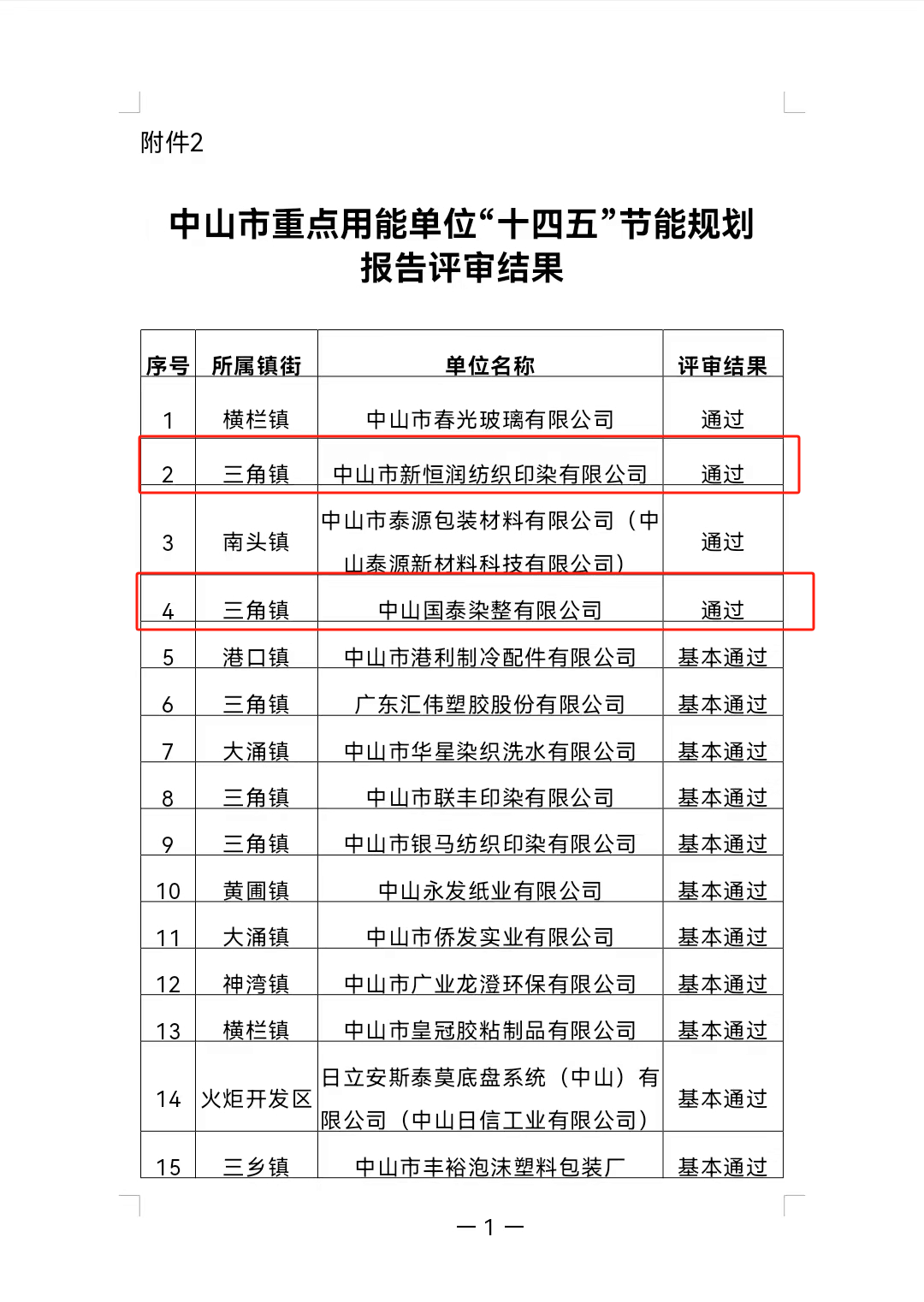 2023年11月,中山市发展和改革局依法依规委托专家,对项目报告进行评审。最终公布中山市共71家企业完成能源审计和“十四五”节能规划工作,其中4家企业取得“通过”评审结果,65家企业取得“基本通过”评审结果,2家企业开展异常。我司服务的中山国泰染整有限公司和中山市新恒润纺织印染有限公司均取得“通过”结果,属于4家“通过”企业之一。